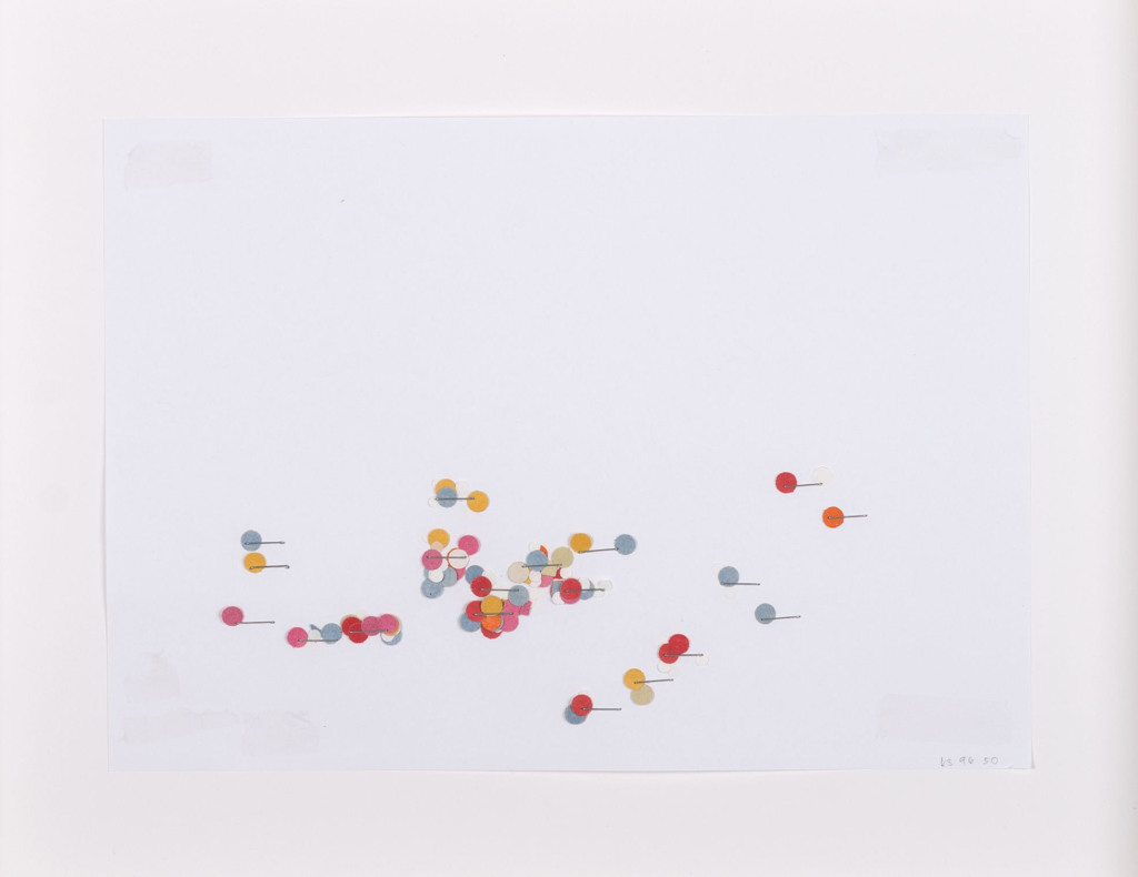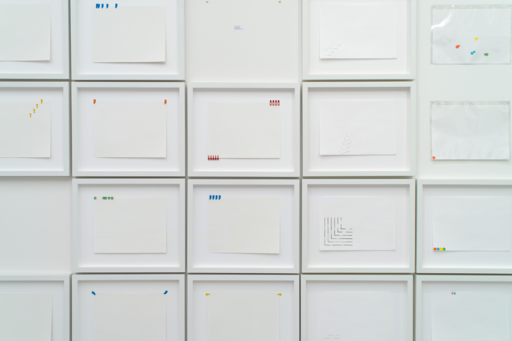 Den größten und letzten Teil der Ausstellung stellen die Office Works dar. Hunderte Blätter, teilweise gerahmt, teilweise in Klarsichtfolien gesteckt, bedecken die Wände und verwandeln die Kunsthalle in einen endlosen Schreibtisch. Auf dem weißen Papier sind mal Büroklammern, mal Striche und Muster, farbige Punkte oder Post-its zu entdecken. Jedes Blatt ist individuell und doch bilden sie manchmal ganze Serien oder Variationen eines Gedankens, den Karin Sander einmal gehabt haben muss. Zwischen all dem Wirrwarr gilt anscheinend nur ein Prinzip: