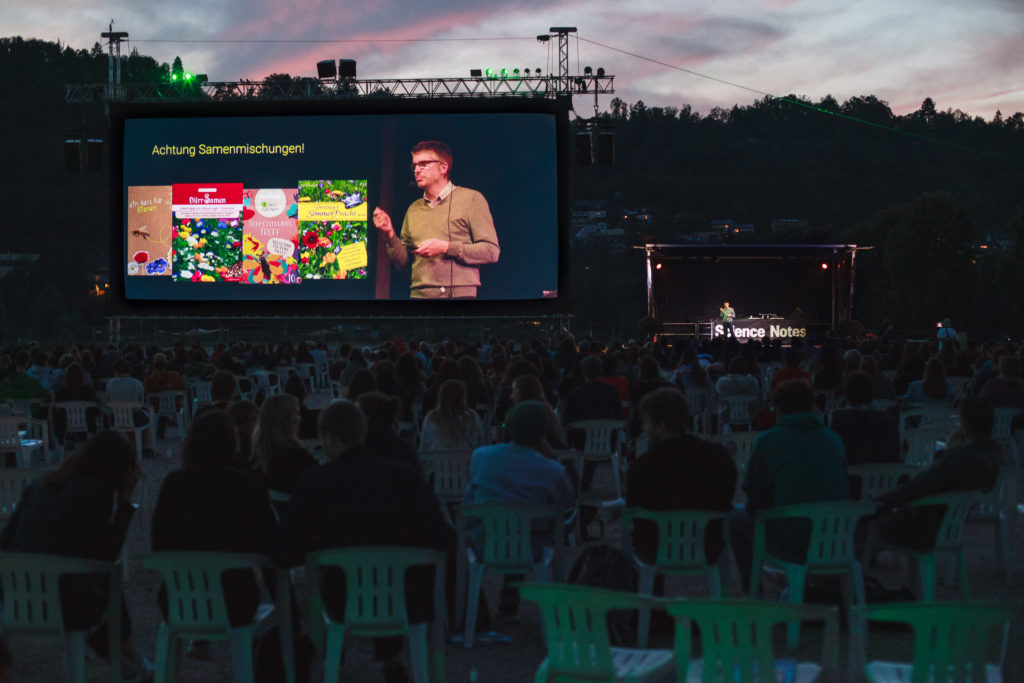 Nach einer kleinen Zwischenfragerunde mit Dominik Eulberg und einer interaktiven Bestimmungsübung für Vogelstimmen war es mit abnehmendem Tageslicht Zeit für Prof. Dr. Oliver Bossdorf, das Publikum nun auch (endlich!) in den Genuss eines Vortrages mit visueller Unterstützung zu bringen. Dies meisterte er gekonnt und erzählte dem Publikum eine interessante und gleichzeitig beängstigende Geschichte, wie der Japanknöterich seine Reise aus Asien antrat und sich als invasive Pflanze aggressiv über ganz Nordamerika und Europa verbreitete. Dass der Japanknöterich nicht das einzige Beispiel hierfür ist, mag wohl in der Bevölkerung weitestgehend bekannt sein, dass wir jedoch mit den meisten im Handel erhältlichen Samenmischungen aktiv dazu beitragen, potentiell invasive Arten nach Europa zu holen, vermutlich nicht. In diesen sind oftmals exotische, nicht heimische Pflanzenarten enthalten, von denen sich einige aggressiv ausbreiten können. Durch die Aussaat in den eigenen Garten wird deren Verbreitung unbeabsichtigt begünstigt. Insbesondere mit Blick auf die derzeitig ablaufenden klimatischen Veränderungen gibt es laut Bossdorf Grund zur Sorge, dass dieses Thema gerade erst so richtig in Fahrt kommt.