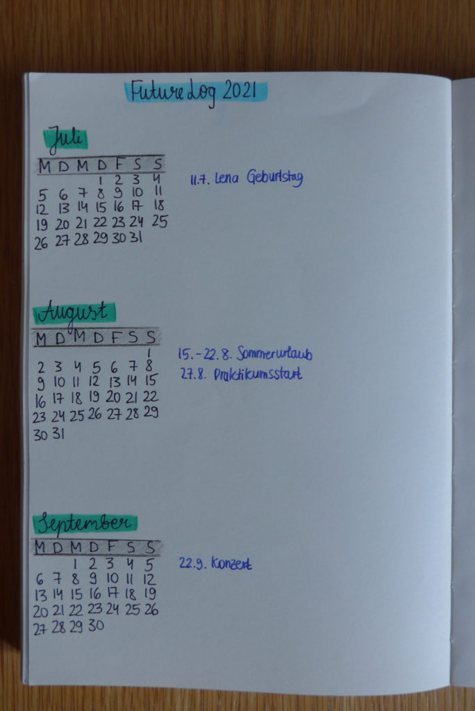In der Futur Log werden alle ausstehenden Monate des Jahres aufgeführt. Auch hier kann individuell entschieden werden, wie weit in die Zukunft die Futur Log reichen soll. Auf diese Weise ist es auch möglich, langfristige Termine zu notieren und besser planen zu können. Eine weitere Möglichkeit ist das Festlegen einer Seite, auf der listenartig die Termine eingetragen werden können, die über die gestaltete Futur Log hinausreichen. Auf diese Weise werden die Termine nicht vergessen und es kommt zu keiner Überschneidung.