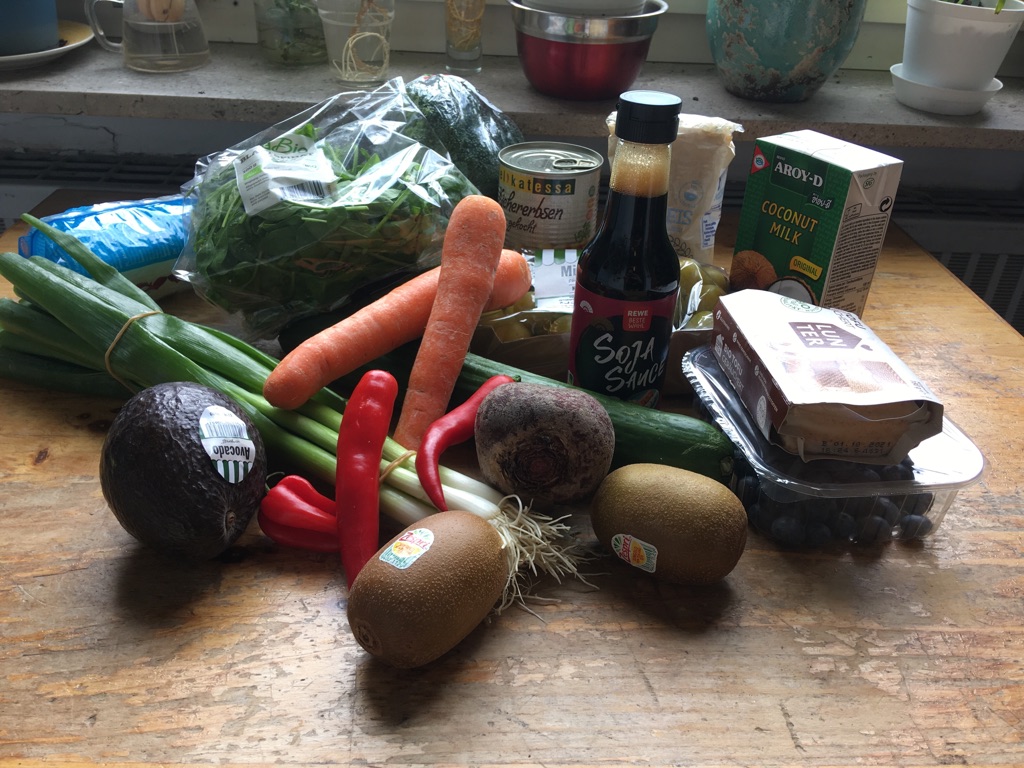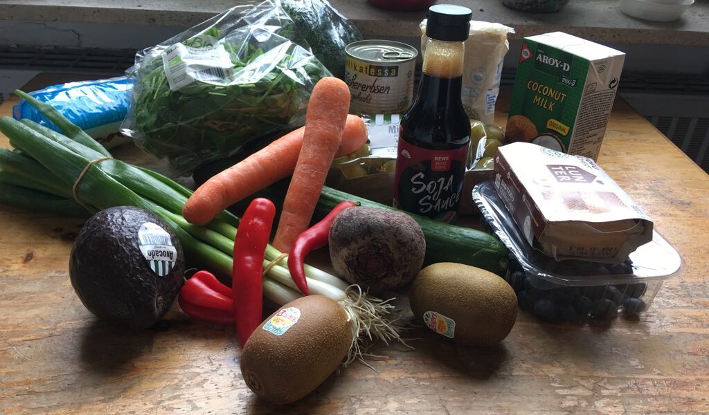 Ein normaler Einkauf nach der Challenge (Die Aufkleber auf dem Obst enthalten übrigens auch Plastik, genauso wie Tetrapaks)