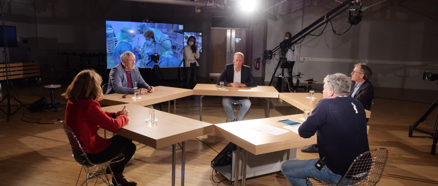 Normalerweise drehen in der Klinischen Anatomie Tübingen erfahrenen Chirurg*innen und Anästhesist*innen Lehrfilme für Studierende. Am 02.12.21 fand hier eine übertragene Podiumsdiskussion statt. Die besprochenen Themen wurden durch Videos aus den Stationen begleitet und von den Expert*innen erläutert. Professor Dr. Bernhard Hirt leitete die Diskussion und führt die circa 1500 Zuschauer*innen durch den Abend. Zu Gast waren Michael Schlotterer, pflegerische Bereichsleitung der Intensivstation 39; Prof. Dr. Dr. Urban Wiesing, Ethik und Geschichte der Medizin; Prof. Dr. Stefanie Joos, Allgemeinmedizin & Interprofessionelle Versorgung und Prof. Dr. Peter Rosenberger, Anästhesiologie und Intensivmedizin.