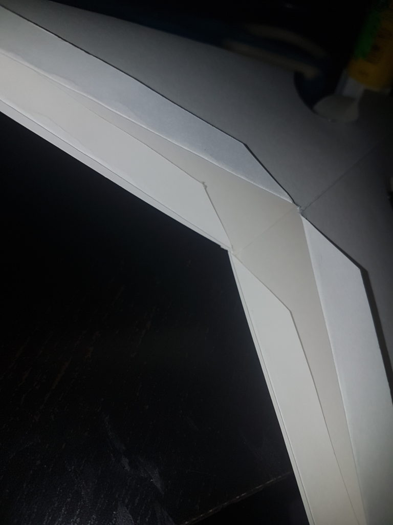 Um die einzelnen Ecken zusammenzufügen, klebst du die herausstehenden Falten unter die faltenlose Seite der nächsten Ecke. Das wiederholst du, bis alle Ecken, bis auf die oberste und unterste, miteinander verbunden sind: