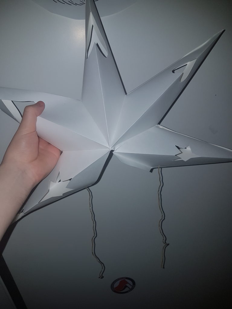 Jetzt musst du den Stern nur noch an den Faltkanten aufklappen und in Form bringen. Mithilfe der Schnüre kannst du deinen Stern über eine Glühbirne binden – et voilà, fertig ist deine selbstgebastelte Sternenlampe.