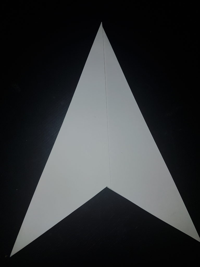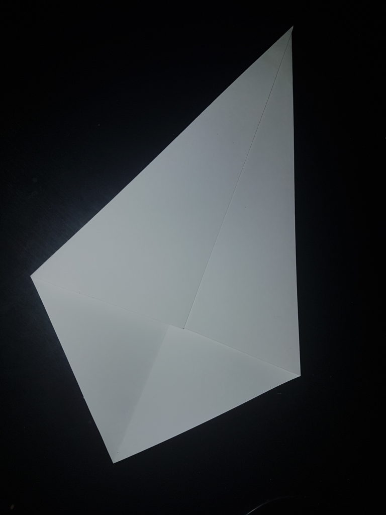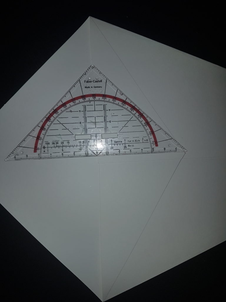Mache, von der Falzlinie der kürzeren Seite ausgehend, bei 7,5cm einen Punkt und zeichne jeweiles eine Linie zu den Ecken des Blattes, wie auf dem Bild angezeigt. (Ich habe für mein Beispiel ein A3 Blatt verwendet, bei anderer Größe weichen die Werte ab.)