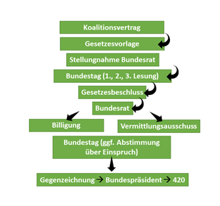Nach und nach werden die Ziele der Ampel-Koalition in den Ministerien ausgearbeitet, die Gesetzesvorlagen werden dann dem Bundesrat zur Stellungnahme vorgelegt. Die Bundesregierung kann die einzelne Gesetzesvorlage überarbeiten oder zur Abstimmung in den Bundestag einbringen, wo die erste, zweite und dritte Lesung stattfinden. Wird die Vorlage vom Bundestag abgelehnt, gilt das Gesetz als gescheitert, wird ihr zugestimmt, ist das Gesetz beschlossen.