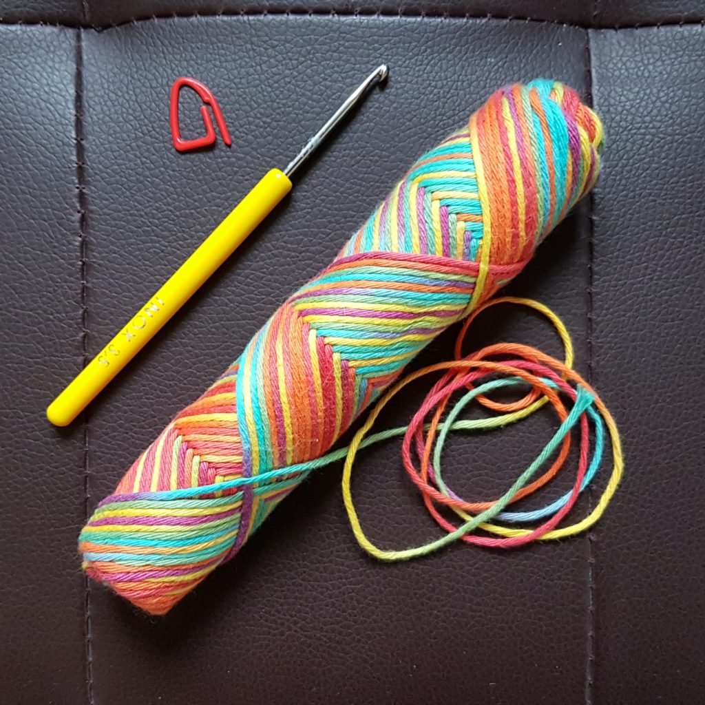 - Wolle (am besten festes Baumwollgarn, weil damit die Struktur dicht genug wird und sich Baumwollgarn zudem bei 60°C waschen lässt) Good to know: Ich habe 6€ für 2 Wollknäuel ausgegeben