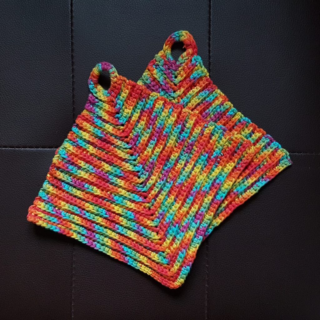 Du kannst deinen Topflappen beliebig groß machen, das ist ganz deinem persönlichen Geschmack überlassen. Am Ende angelangt, musst du den Faden nur noch abschneiden, durch die letze Masche durchziehen, den Knoten festziehen und das Fadenstück mithilfer einer Nadel zischen den Maschen vernähen. Viel Spaß und gutes Gelingen 🙂