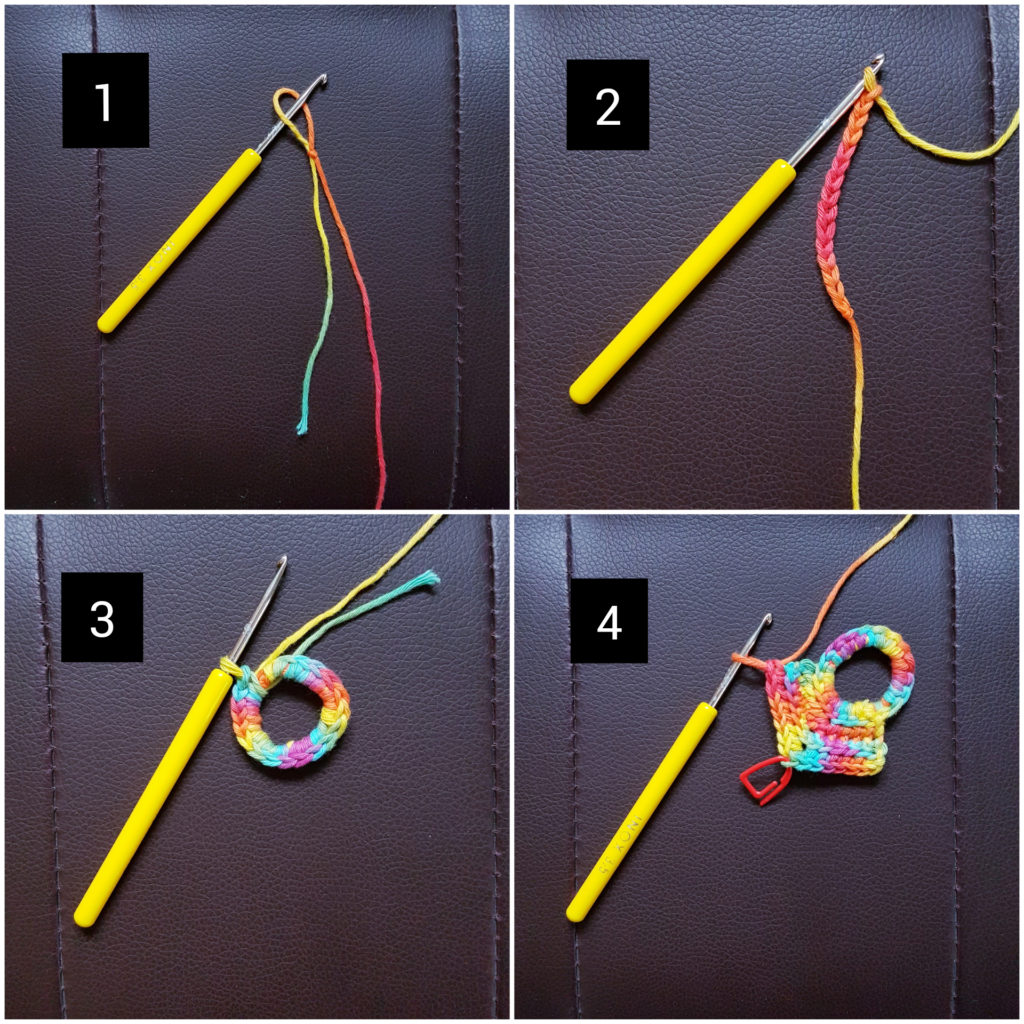 Nachdem du die erste Schlaufe geknotet hast, startest du mit 15 Luftmaschen. Die erste und die letze Masche werden miteinander verknüpft, wodurch ein Kreis entsteht. Diesen musst du nun mit 20 Kettmaschen umhäkeln. So entsteht die Lasche, um den Topflappen aufhängen zu können. Wenn du diesen Teil geschafft hast, beginnt die Arbeit amTopflappen selbst. Du startest mit einer Luftmasche, ehe du an dem bereits gehäkelten Kreis entlang 4 Kettmaschen häkelst. Achte darauf, dass du immer nur in den hinteren Teil deiner bereits gehäkelten Masche stichst. In die 5. Masche kommen drei Kettmaschen hintereinander, um das Lochmuster zu schaffen. Die 2. der drei Kettmaschen bildet hierbei die Mitte, in welche nachher erneut 3 Kettmaschen gehäkelt werden. Danach häkelst du wieder 4 Kettmaschen weiter. Nun folgt erneut eine Luftmasche, ehe sich das Ganze in die entgegengesetze Richtung wiederholt, der Topflappen wird nun also gedreht. Dieses Mal werden 5 Kettmaschen gehäkelt, ehe wieder 3 Kettmaschen hintereinander in der 6. Masche erfolgen. Um auf Dauer nicht den Überblick zu verlieren, in welche Masche du 3 Kettmaschen hintereinander häkeln musst, bietet sich ein sogenannter Maschmarkierer an. Damit lässt sich die Masche markieren, in welcher in der nächsten Reihe die 3 Kettmaschen in Folge gehäkelt werden müssen (s. Bild 4).