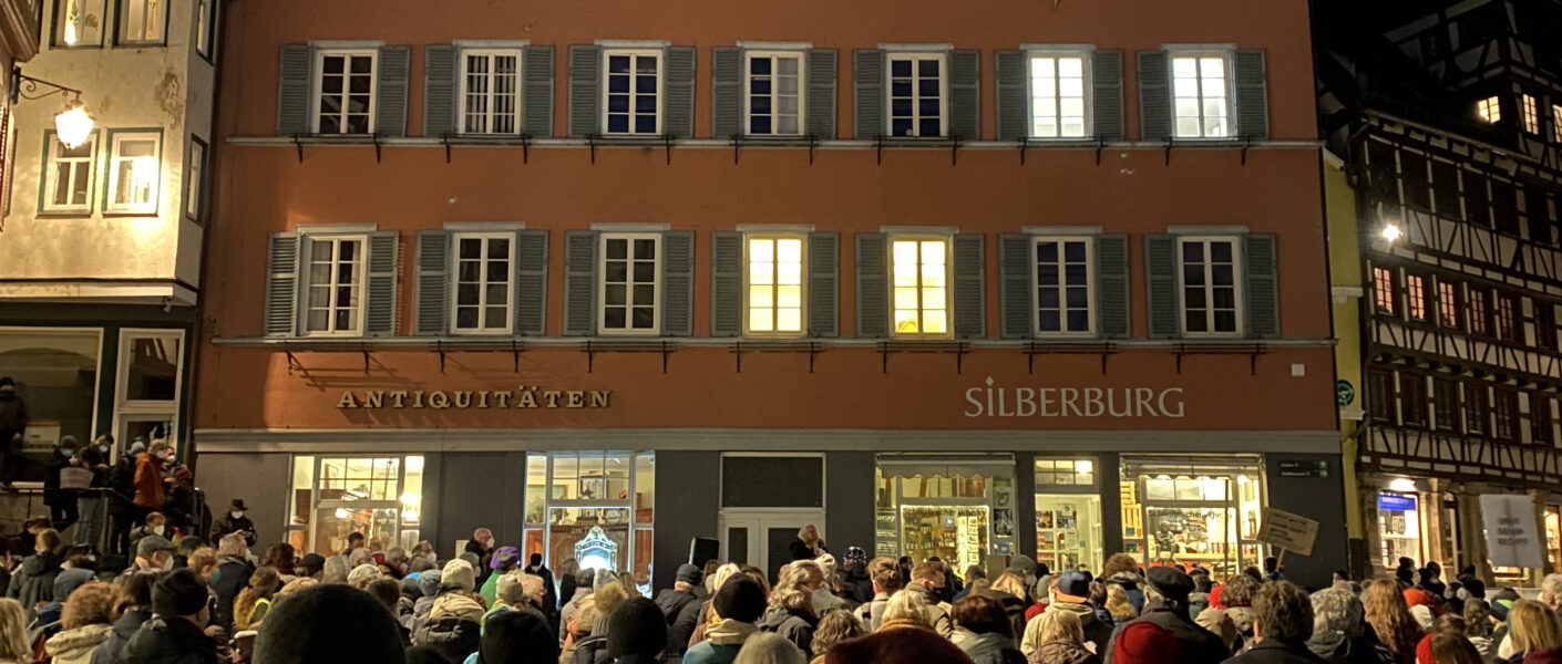 Als die Kundgebung vorbereitet wird, hat sich um den Brunnen bereits eine große Menschentraube gebildet. Auf dem Brunnen steht ein Mann, der in die Menge ruft, dass sie, die Kritischen, die Querdenker*innen, für einen Dialog offen seien und alle Meinungen akzeptieren. Viele tragen Kerzen oder Lichterketten, einige halten bunte Plakate in die Höhe. Die Bundesregierung und die Landesregierung werden zum Rücktritt aufgefordert. Jemand trommelt laut. Bald füllt sich auch die Seite des Marktplatzes, die der Kundgebung Tübingen Bleibt Stabil zugewiesen wurde. Die Organisator*innen weisen die Redner*innen und Ordner*innen ein. „An Abstände und Maskenpflicht erinnern und gegebenenfalls deeskalieren“, so lautet die Anweisung an die Ordner*innen. Kurz nach 18 Uhr eröffnen Adrian Kaske und Nathalie Denoix von der SPD Tübingen die Kundgebung. Es folgen mehrere Redebeiträge, etwa von Fridays For Future, von Timo (FSVV), der den Studierendenrat vertritt, dem DGB, der Linken und der Diakonie. Je weiter hinten man steht, desto stärker werden die Redner*innen von lautem Gesang, Sirenen und Trommeln von der anderen Seite übertönt. Einander zuhören und Dialog suchen? Eher schwierig.