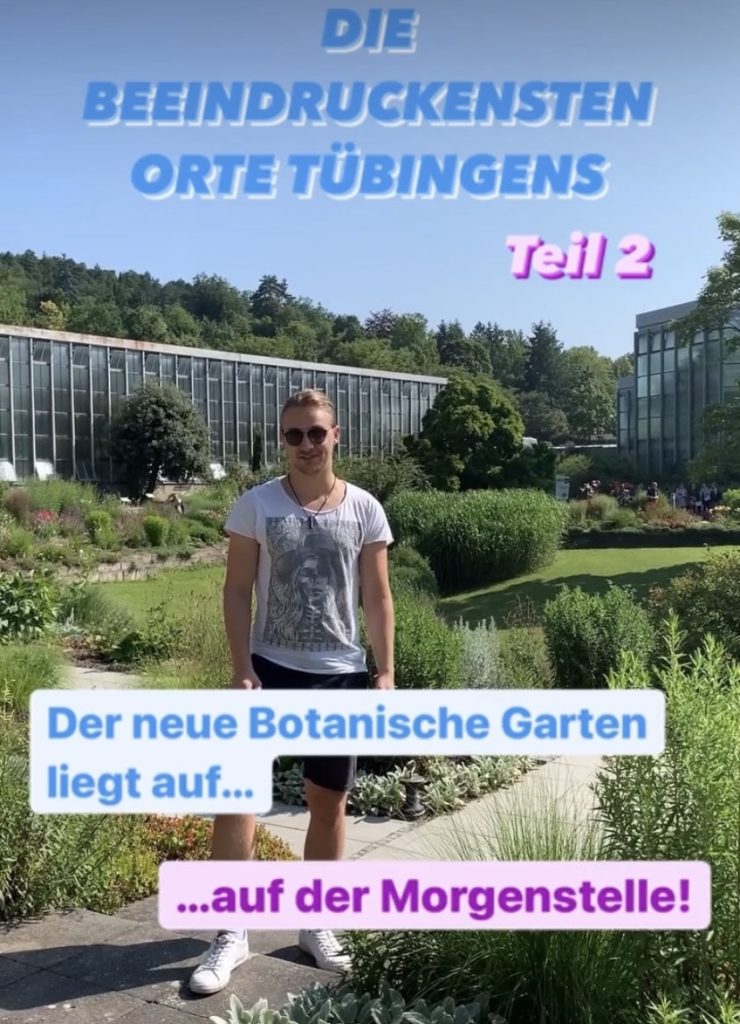 Tony: Vor der Kamera zu stehen war zum allergrößten Teil unsere Aufgabe. Wir hatten wöchentlich immer eine Redaktionssitzung, wo die Themen besprochen wurden – mal ein Interview, mal eine Straßenumfrage. Zwar waren wir an den Ideen beteiligt, aber letztendlich haben wir eher die Texte vorgetragen. Die Projekte, die wir gemacht haben, waren zwischen uns beiden. Angefangen haben wir ja im September 2020, da war die ursprüngliche Idee primär, den Infotag, der in November stattfindet, zu machen. Wir hatten auch eine Serie, die hieß „die beeindruckendsten Orte in Tübingen“ oder „Orte zum Lernen“, um teilweise die Stadt zu erkunden oder ein Institut vorzustellen – mit dem Fokus auf Tübingen, was die Stadt alles zu bieten hat. Wir haben auch Flyer ausgedruckt, um an den Schulen zu werben. Vor Ort haben die Schüler und Schülerinnen Fragen gestellt und ich habe sie beantwortet. Ich war überrascht, wie viel Respekt sie vor der Uni hatten, auch eine generelle Unsicherheit war auf jeden Fall da. Man musste ihnen einiges um das Studium klarmachen, so dass sie nicht sofort in Panik verfallen.