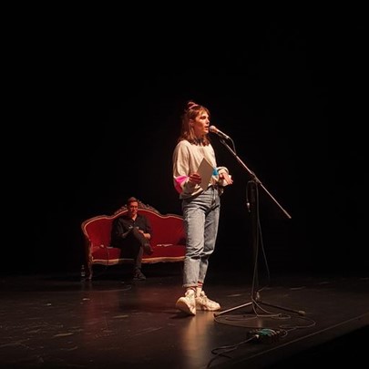 Seit fast zwei Jahrzehnten organisiert die 46-jährige jeden Monat den Poetry Slam hier im Landestheater Tübingen. Das Format ist so unkompliziert und erfrischend wie sie selbst: 7 Künstler*innen, 6 Minuten Redezeit und keine Requisiten auf der Bühne. Beim Poetry Slam präsentieren unterschiedlichste Menschen ihre selbstgeschriebenen Texte vor Publikum. Inhaltlich darf es buchstäblich um alles gehen. Vorhand auf, Scheinwerfer an, nur du und dein Text. Keine Gitarre, kein Stofftier, kein Gesang.