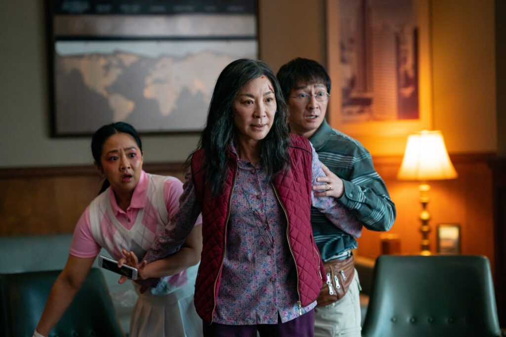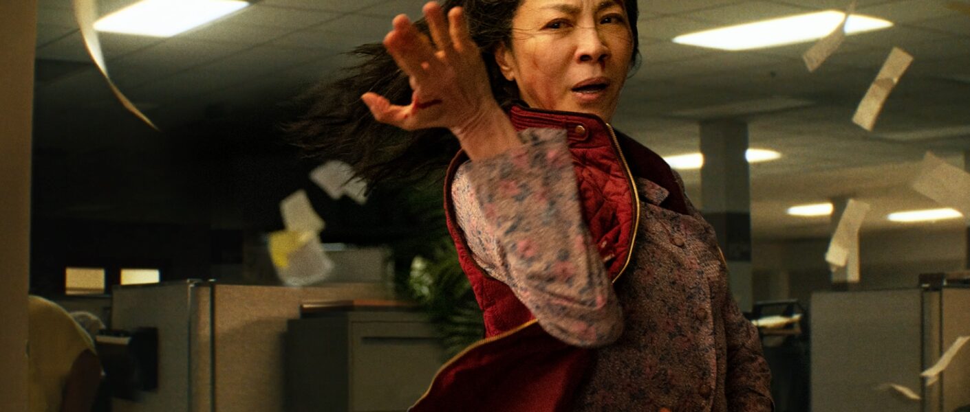 Der Film von Dan Kwan und Daniel Scheinert erzählt auf eine absurde und zugleich originelle Art und Weise vom Leben der chinesischen Einwanderin und Waschsalonbesitzerin Evelyn Wang (Michelle Yeoh), das alles andere als schön scheint. In ihrer Steuererklärung ist Evelyn ein Fehler unterlaufen, der das Ende ihres Waschsalons bedeuten könnte. Doch natürlich ist das nicht Chaos genug, denn plötzlich steht ihr Vater (James Hong) vor der Tür. Dieser hat ihre Entscheidung, nach Amerika zu ziehen, nie unterstützt. Zudem möchte ihr Ehemann Waymond (Ke Huy Quan) die Scheidung einreichen, während gleichzeitig Evelyns Beziehung zu ihrer Tochter Joy (Stephanie Hsu) endgültig zu zerreißen scheint. Die perfekte Grundlage für ein typisches Familiendrama. Doch stattdessen erscheint plötzlich „Alpha Waymond“, ihr „Nicht-Ehemann“ oder besser gesagt ihr Ehemann aus einem anderen Universum. Zusammen mit ihm eröffnen sich Evelyn die Chancen und Gefahren des Multiversums. Dadurch lernt sie die Leben und Fähigkeiten kennen, die sie hätte erfahren können, und sieht sich plötzlich gegen ihren Willen mit der Aufgabe konfrontiert, die Welt vor dem ungeahnten Bösen zu bewahren.