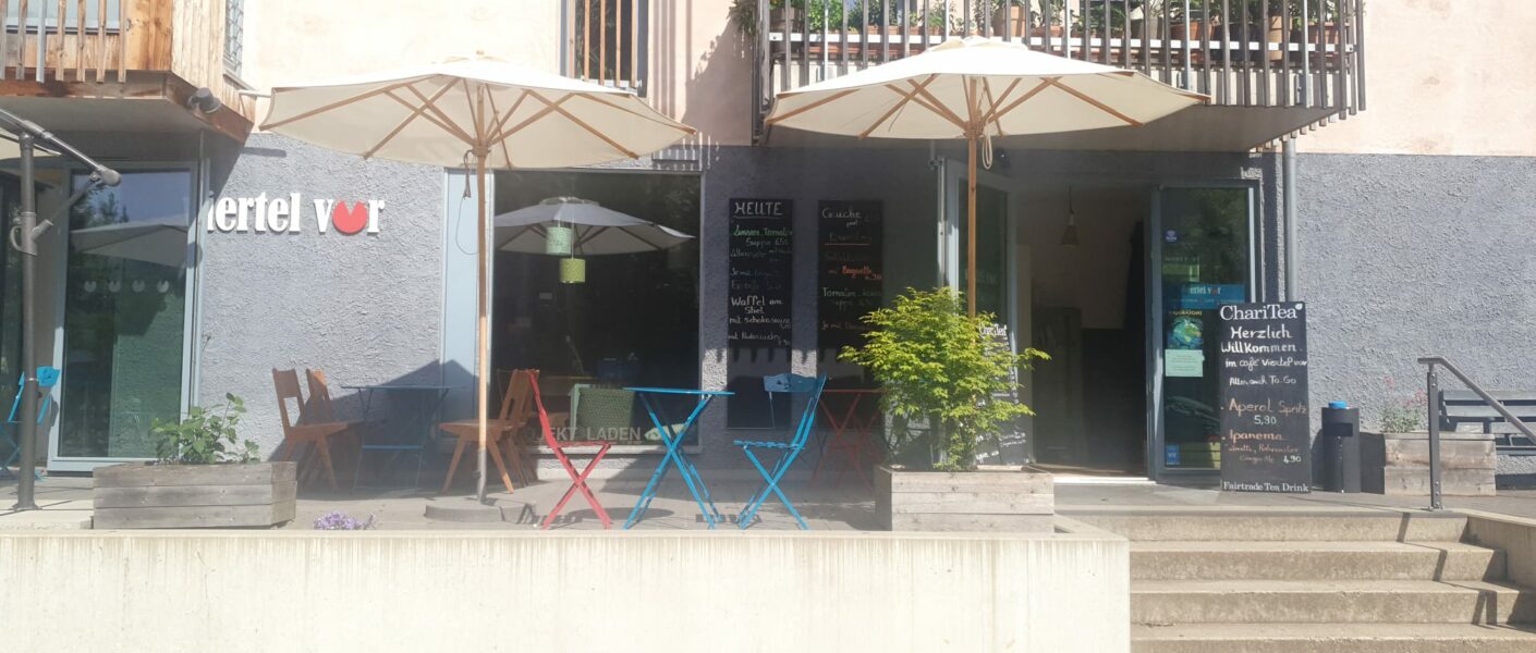 Der Treffpunkt war eine kleine Straßenkreuzung in Lustnau um 18:20. Als Erster vor Ort war Nelson Butterfield, der Redner, dem wir später noch ein paar Fragen stellen konnten. Als sich um halb sieben an der Kreuzung etwa 10 weitere Leute versammelt hatten, ging man ums Eck in das für den Vortrag gemietete Café “viertel vor”.