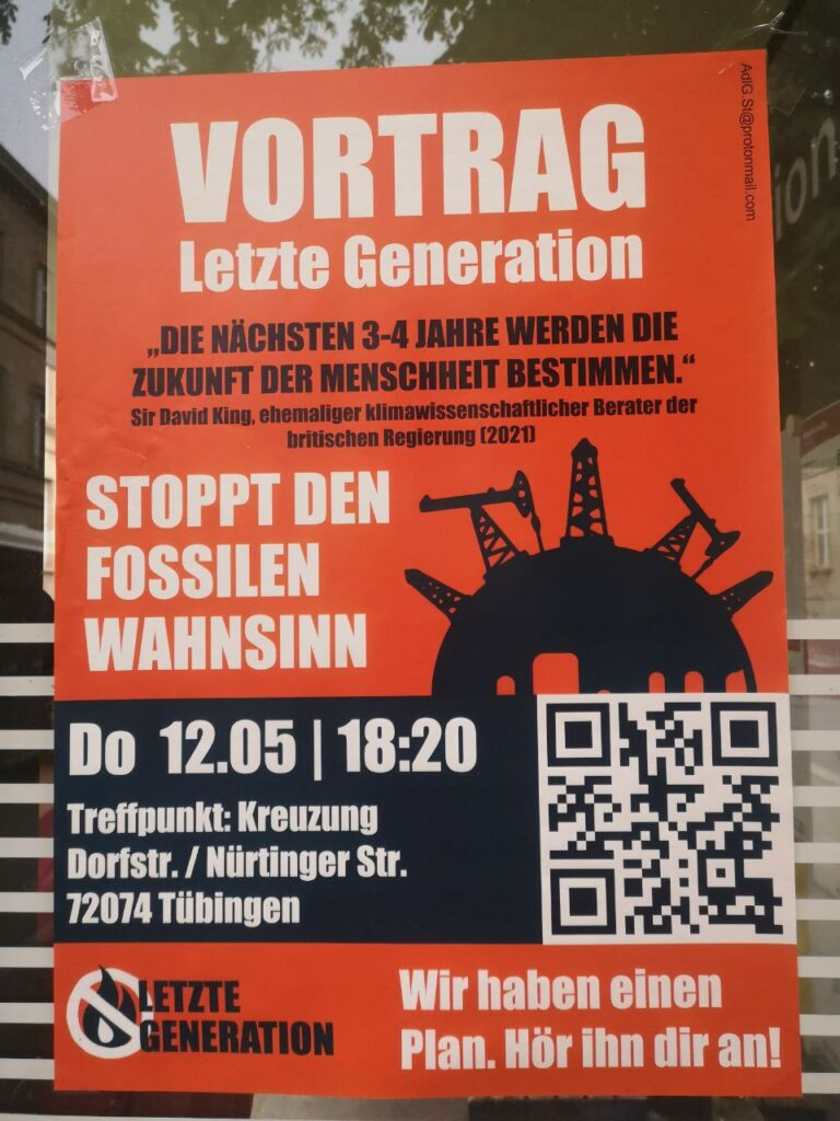 In den letzten Wochen waren in ganz Tübingen Plakate der „Letzten Generation“ zu sehen, die zu einem Vortrag einluden. Zu lesen war die Forderung „Stoppt den fossilen Wahnsinn!“ – auf den Abbau fossiler Rohstoffe bezogen. In mehreren Städten wurde dieser Vortrag am Donnerstag, den 12. Mai, das erste Mal gehalten und wird bis Ende Juni bundesweit an verschiedenen Standorten zu sehen sein. Doch wer ist diese Letzte Generation, und warum wird für einen Vortrag eine so große Kampagne abgehalten?