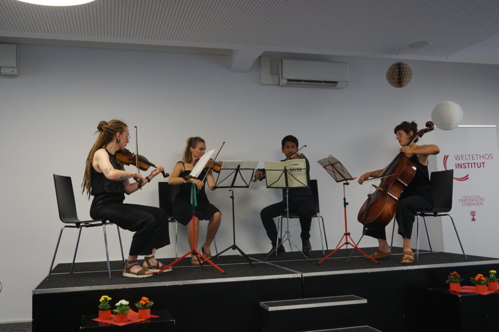 Kurz nach 19 Uhr lädt das Streichquartett musikalisch die Besucher*innen im Welt-Ethos-Institut dazu ein sich zu setzen. In dem gut klimatisierten Gebäude finden sich nur noch vereinzelte leere Stühle, als das Streichquartett sFOURzando mit einem Stück von Joseph Hydn feierlich den Abend beginnt.