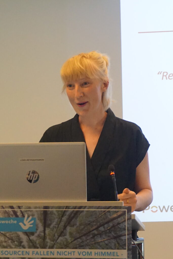 Nach einer kurzen Vorstellung betritt die eingeladene Festrednerin Hannah Pilgrim die Bühne. Sie ist Koordinatorin des Arbeitskreises Rohstoffe bei PowerShift e.V. und verkündet, sehr stolz zu sein, nach Frau Amtsberg und Frau Köberlein sprechen zu dürfen. Sie stehe aber nicht alleine vorne, sagt sie zu Beginn ihrer Rede. Das Buch “Revolution für das Leben” von Eva von Radecker habe sie so geprägt, dass sie ihr auch einen Platz auf der Bühne gibt.