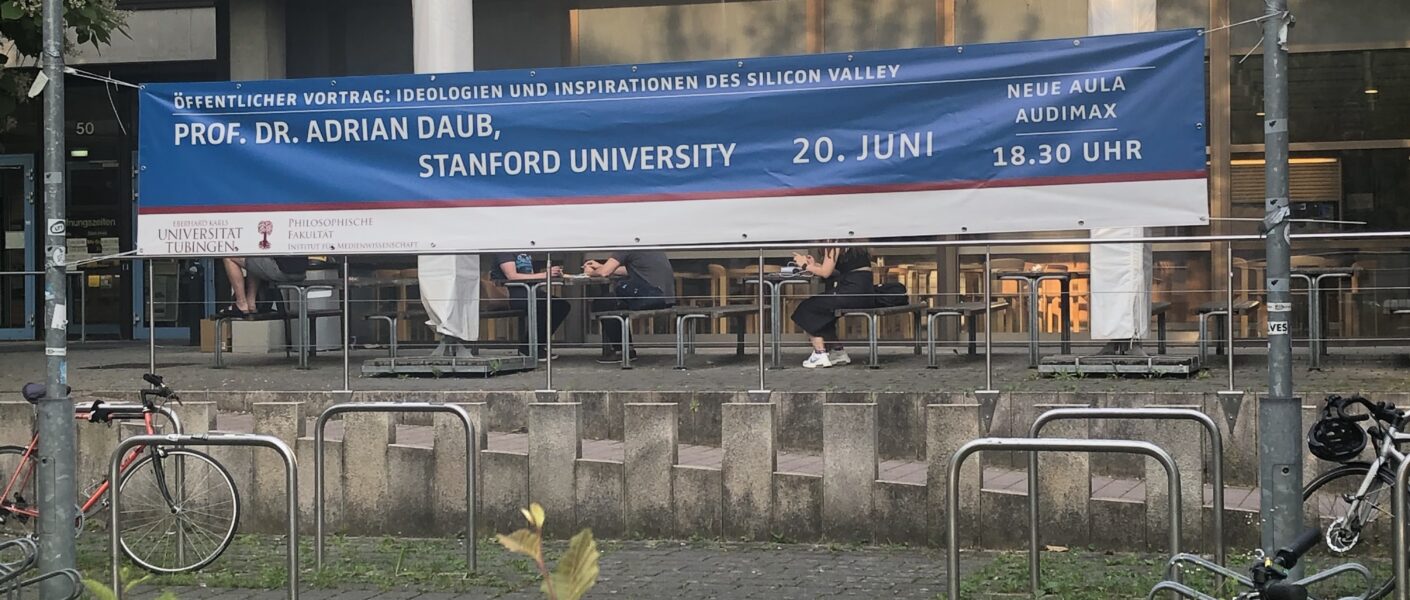 Es ist ein sommerlicher Montagabend, doch trotz des schönen Wetters beginnt sich bereits kurz nach sechs das Audimax der Universität mit Interessierten zu füllen. Um 18:30 Uhr eröffnet der Tübinger Medienwissenschaftler Prof. Dr. Bernhard Pörksen die Veranstaltung und übergibt das Wort nach einer kurzen Einführung an Prof. Dr. Adrian Daub.