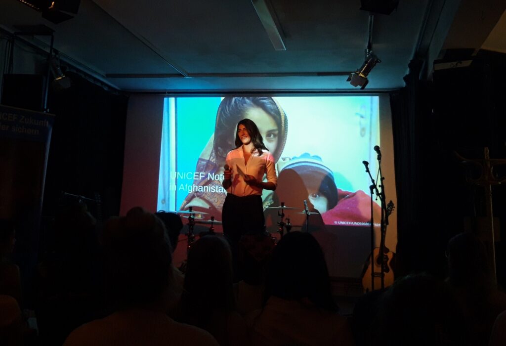 Danach geht es weiter mit dem Poetry Slam von Richard König, dessen Einleitung das Publikum ständig zum Lachen bringt. Vor der Pause präsentiert noch Naray aus der Hochschulgruppe die aktuelle Lage in Afghanistan und erzählt über ihre persönliche Familiengeschichte: Ihr Großvater hat sich in Afghanistan für Menschen engagiert, bis er schließlich wegen Gefahr flüchten musste. Nun arbeitet Naray in seinen Fußstapfen weiter. Ihre Erzählung bringt das Publikum wieder zum Schweigen, die Tränen sind nicht weit weg.