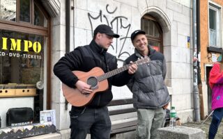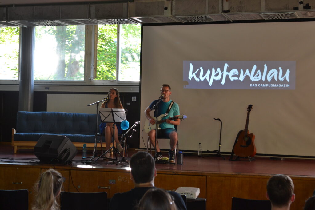 Eine kleine Abwechslung vom Journalismus bot das bereits von der Ersten Kupferblauen Kunstschau bekannte Tübinger Duo ‘Sarah und Benni’. Mit Gesang und Gitarre brachten sie Soul- und Popmusik ins Clubhaus. Ihre charakteristische Kombination aus vollem Klang und lockerer Atmosphäre sorgte für Begeisterung bei den Besucher*innen der Jubiläumsfeier.