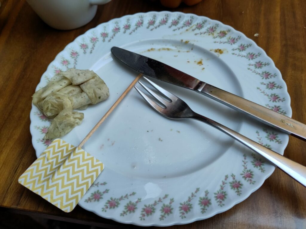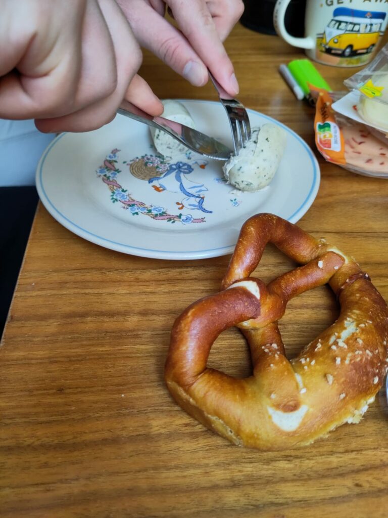 Der Startschuss wurde durch das Anstoßen gesetzt. Als alle Teller gehäuft waren, begann mein Unwissen deutlich zu werden. Ich wollte die Weißwürste einfach in Scheiben schneiden und wurde schnell unterbrochen. Zuerst die Haut entfernen. Aber wie?
