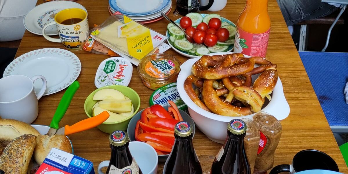Frühstücken ist für mich etwas ganz Besonderes. Im Normalfall gibt es das bei mir nichts und wenn doch, dann richtig. So auch an besagtem Sonntag, an dem ich mein erstes Weißwurstfrühstück genoss. Da ich eingeladen war, hatte ich sogar den Luxus mich an einen fertig gedeckten Tisch setzen zu dürfen. Es fehlte an nichts. Rohkost, Obst, Brötchen, Aufstriche, Säfte und selbstverständlich Brezeln, süßer Senf, Weißwürste und Weißbier türmten sich.