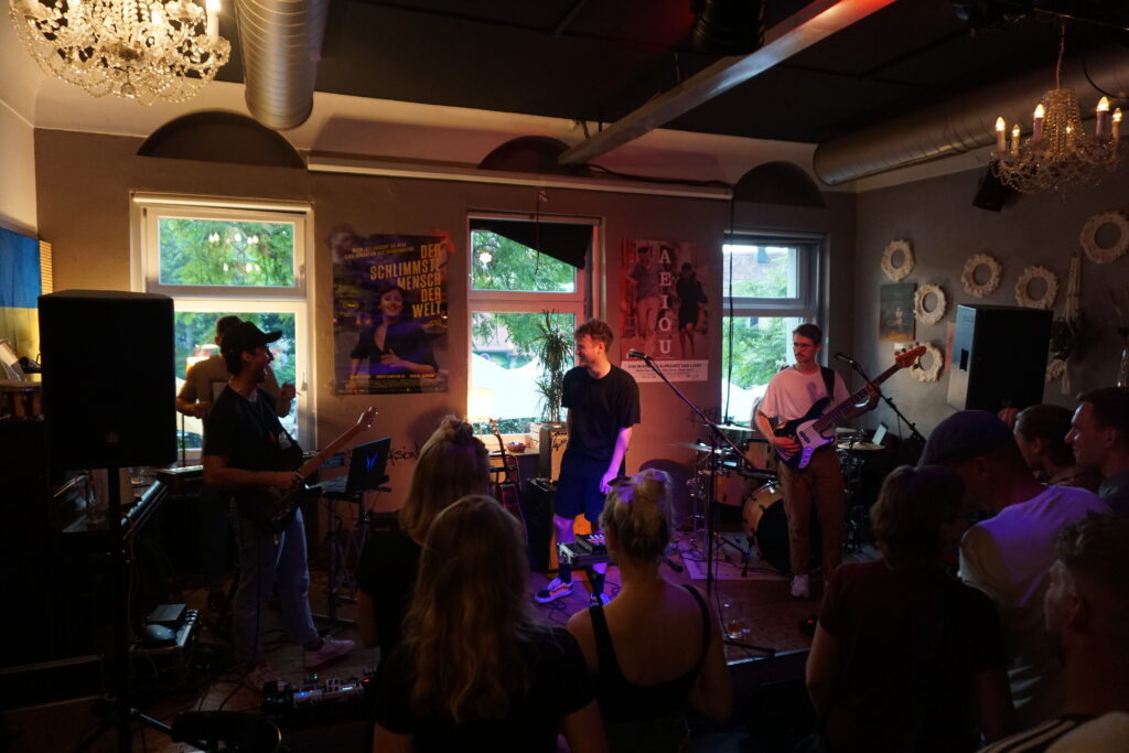Einer der vielen Auftritte diesen Sommer: am 29. Juni im Cafe Haag. Rechts am Bass Lukas, dahinter am Schlagzeug versteckt Fabi, Jakob in der Mitte, links Benni und dahinter Nathan. © Inga Lenßen