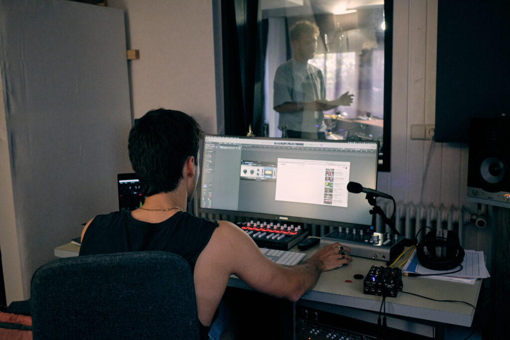 Das Studio in Gärtringen hat Benni zusammen mit seinem Vater und Großvater selbst eingerichtet – für Besucher*innen sieht das ziemlich professionell aus. „Heute würde ich vieles ganz anders machen“, sagt Benni lachend. Man merkt trotzdem, er ist stolz auf diesen Ort im Keller seiner Großeltern. Die Energie, die in diesem kleinen Raum mit grauer Couch, mehreren Gitarren und Schaltflächen mit allerlei Knöpfen entsteht, ist großartig. Die Jungs haben Bock auf Musikmachen, spielen rum, probieren aus. Sie erzählen begeistert, wie die Songs des neuen Albums entstanden sind, die Geschichten dahinter und wie diese vertont wurden.
