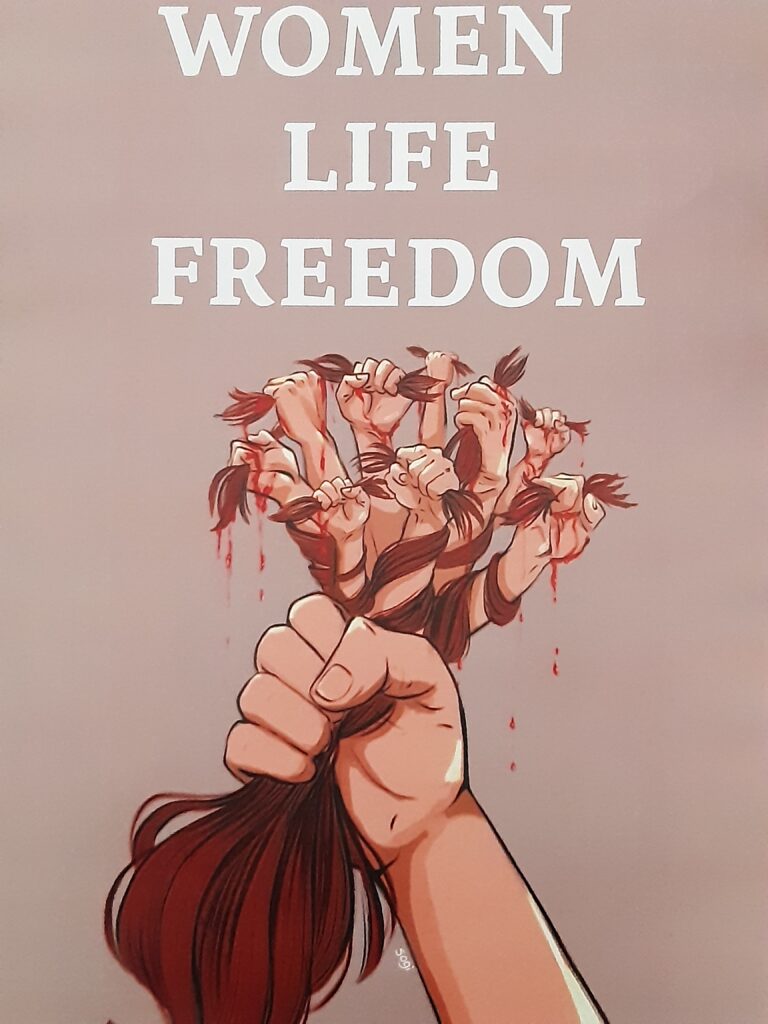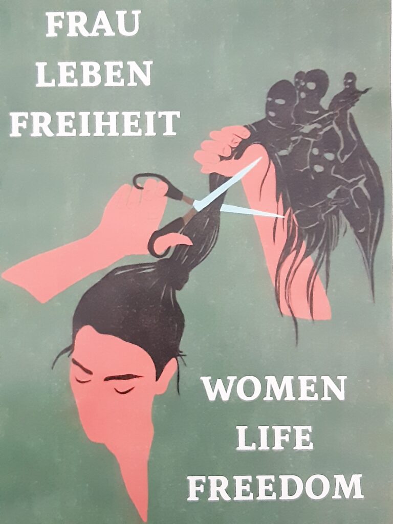 Ein weiteres Symbol sind Frauen, die ihre Haare abschneiden. Beides war auf den Plakaten der Kundgebungsteilnehmer*innen häufig zu sehen.