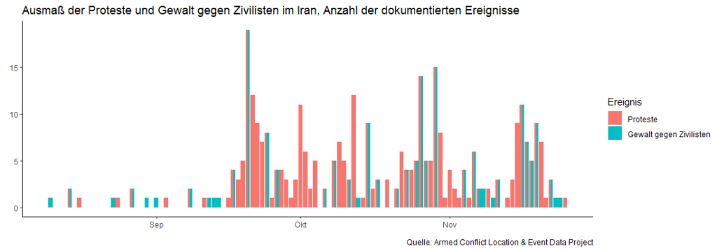 Wer im Iran demonstriert, geht ein hohes Risiko ein, denn die Sicherheitskräfte gehen mit massiver Gewalt gegen die Demonstrierenden vor. Die hier dargestellten Zahlen stellen nur dokumentierte Fälle von Gewalt gegen die Zivilbevölkerung dar. Es ist jedoch davon auszugehen, dass die allermeisten Fälle undokumentiert und somit unberücksichtigt bleiben.