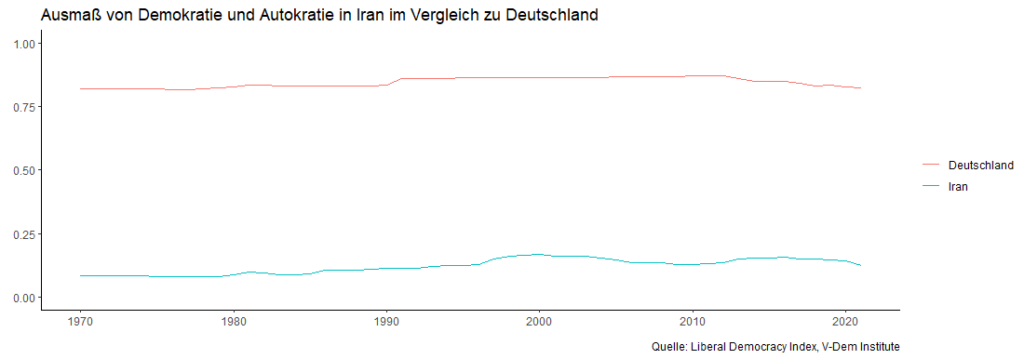 Bereits vor der islamischen Revolution von 1979 war Iran ein autoritärer Staat und daran hat sich bis heute nichts geändert. Zwar finden regelmäßig Wahlen statt, diese sind allerdings weder frei noch fair. Das politische System des Iran wird daher in Fachkreisen oft als elektorale Autokratie bezeichnet.