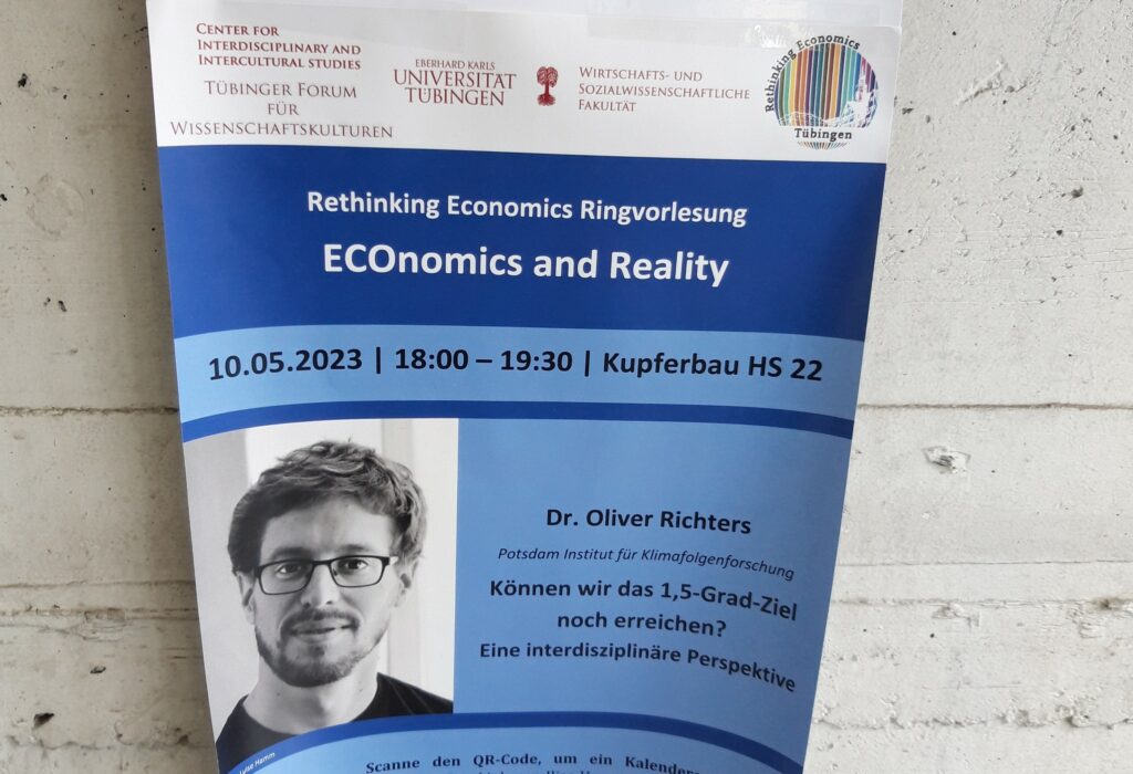 Am 12. Dezember 2015 wurde das berühmte Pariser Klimaabkommen verabschiedet. Es sieht vor, die Erderwärmung möglichst auf 1,5 Grad zu begrenzen. Wo stehen wir heute, 89 Monate später? Ist das Ziel noch in Reichweite? Und was ist zu tun? Antworten gab Dr. Oliver Richters am 10. Mai im Kupferbau bei der Ringvorlesung „ECOnomics and Reality“.