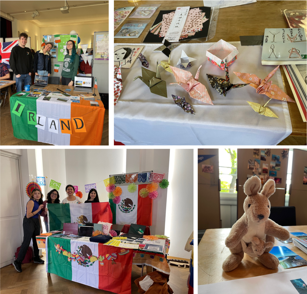Alle Teilnehmer*innen hatten sich viel Mühe gegeben, ihre Stände schön zu dekorieren und ihr Land so zu präsentieren, dass man Lust hat, dorthin zu gehen. Kreativität war gefragt, so brachten die algerischen Studierenden unter anderem ein traditionelles Gewand und eine Briefmarkensammlung mit, die Japanerinnen und Japaner hatten ihre Origami-Fähigkeiten unter Beweis gestellt, und die Studierenden aus Irland hatten eine Postkartensammlung mit den schönsten Landschaften der grünen Insel zur Schau gestellt. Zudem wurde jeder Stand vom International Office mit einer großen Flagge des jeweiligen Landes ausgestattet, damit jeder Tisch berets von Weitem erkennbar sei. Welcher Stand der Schönste war, darüber konnte man am Eingang abstimmen.