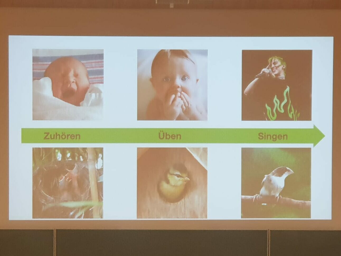 Wie Menschen lernen auch Vögel das gezielte Erzeugen von Lauten durch ihre Eltern, erklärt Veit. Dieser Prozess nennt sich „vokales Lernen“ und ist außer beim Menschen bei nur wenigen Tieren vorhanden, darunter Wale, Robben, Elefanten, Papageien – und natürlich Singvögel. Ob Primaten auch vokal lernen, ist umstritten, trifft aber mit an Sicherheit grenzender Wahrscheinlichkeit nicht zu, da auch Individuen, die in Isolation aufwachsen, dieselben Laute erzeugen können wie solche, die in Gemeinschaften aufwachsen – die Lauterzeugung ist ihnen in die Wiege gelegt worden. Wie beim Menschen gibt es auch bei Singvögeln eine sogenannte „Brabbelphase“, in der die Jungtiere angeborene Laute ausstoßen, die aber noch nicht vollständig entwickelt sind, verglichen mit dem Erwachsenenstadium. Tiere, die nicht vokal über ihr Umfeld lernen, kommen über diese Phase sozusagen nie hinaus. Auch Hunde und Katzen lernen das Miauen und Bellen nicht, sondern beherrschen es von Geburt an, genauso wie Frösche das Quaken.