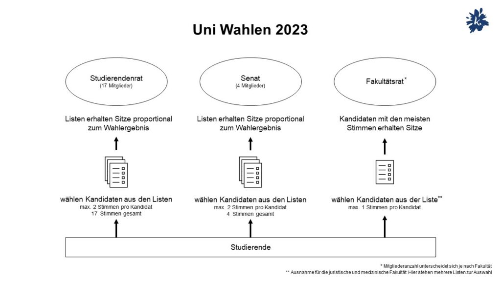 Bei der Wahl zum StuRa und zum Senat haben die Studierenden die Möglichkeit, die Kandidierenden aus mehreren Listen zu wählen. Vor jedem Namen befinden sich zwei Kästchen. Somit kann man durch Ankreuzen beider Kästchen dem bzw. der entsprechenden Kandidat*in maximal zwei Stimmen geben.  Insgesamt kann man für den StuRa 17 Stimmen und für die Wahl zum Senat vier Stimmen auf die Kandidat*innen verteilen. Beachte: Wenn man sich entschieden und ein Kreuz gesetzt hat, kann man dies durch Wegstreichen nicht mehr zurücknehmen. Der Grund dafür ist die maschinelle Auszählung der Stimmen. Insgesamt wird der neue StuRa aus 17 Mitgliedern bestehen, für den Senat werden vier Mandate neu vergeben. Als Erstes werden nur die Listen ausgezählt und wie viele Stimmen diese insgesamt bekommen haben. Nach diesem Verhältnis erhält die Liste dann die Plätze. Jede Liste besetzt dann diese Plätze mit ihren Kandidat*innen, die innerhalb der Liste die meisten Stimmen bekommen haben: Die Kandidat*innen mit den meisten Stimmen von jeder Liste nehmen dann die Sitzplätze ein, die ihrer Liste zugesprochen wurden.