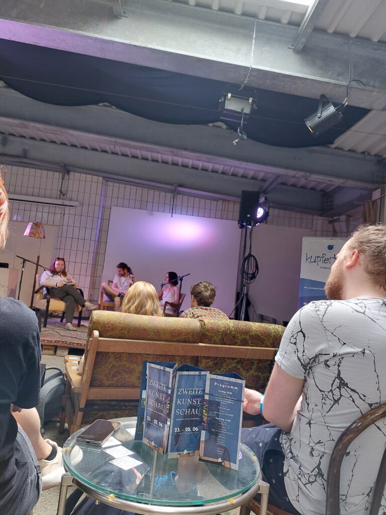 Als I-Tüpfelchen stellte das Café Dona Sá aus Tübingen ein Cafémobil im Innenhof. So ließ sich die Kunstveranstaltung entspannt bei FairTrade Kaffee in der Sonne genießen. Über das Wochenende verteilt besuchten rund 250 Kunstinteressierte die Kunstschau – und das trotz einem so veranstaltungsreichen Wochenende in Tübingen: Zeitgleich fanden auch der CSD in Tübingen und das Rottenburger Neckarfest statt. Auffallend bei der Kunstschau war das gemischte Publikum. Zwischen Mensa und Unicampus gelegen, wurde bei der Veranstaltung in der Shedhalle mit vorwiegend studentischem Publikum gerechnet. Allerdings waren alle Altersgruppen vertreten, nicht zuletzt wegen des breit gefächerten Angebots. Das hatte nämlich zum Ziel, so viele Menschen wie möglich anzulocken, um die Werke der noch recht unbekannten Künstler*innen einem möglichst großen Publikum vorzuführen. Rückblickend lässt sich sagen: Das ist der Kunstschau auf jeden Fall gelungen!