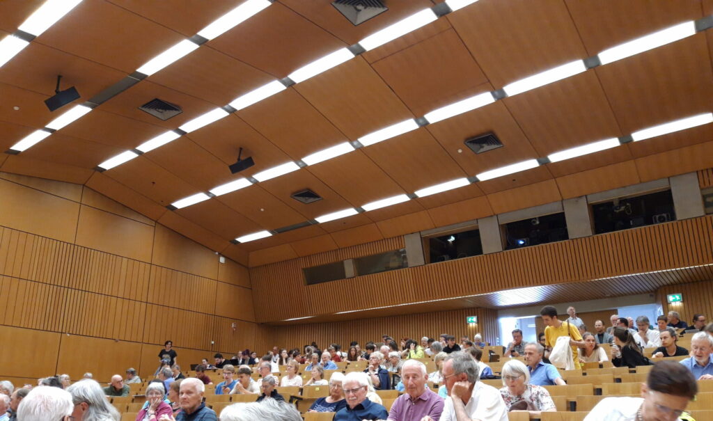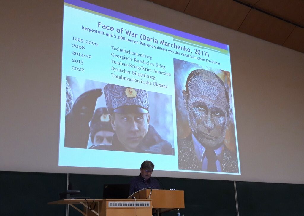 Bei der sich anschließenden Fragerunde werden vor allem aktuelle Entwicklungen thematisiert – das hohe Interesse daran hatte wohl, so könnte man meinen, maßgeblichen Anteil an der hohen Besucherzahl im Hörsaal. Im Hinblick auf den Aufstand der Gruppe Wagner vor einer Woche äußert Gestwa die Vermutung, dass Putin deren Chef Prigoschin wohl nicht verzeihen könne: „Ich würde mal sagen: Seine Lebenszeit hat sich verkürzt.“ Zugleich habe man sehen können, „dass Putin Schiss hat“. Doch mangels politischer Alternativen sehe es für eine mögliche Entputinisierung momentan schlecht aus: „Der Weg ist leider noch verdammt weit.“