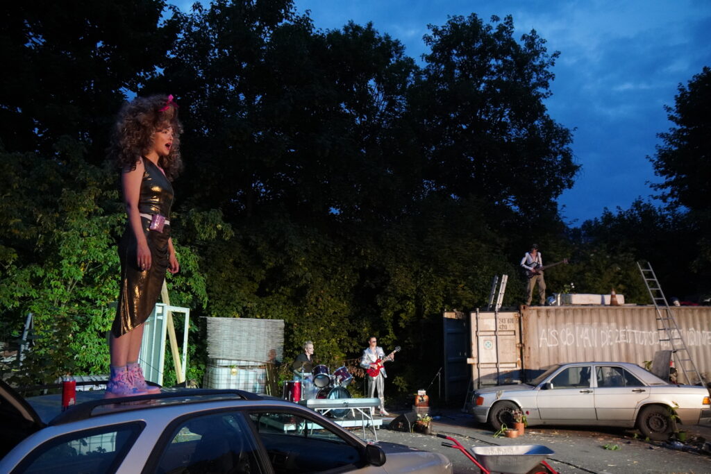 Die Handlung wird immer wieder von Musikstücken unterbrochen. Hier singt He, während Puck an den Drums sitzt, Lysander Bass spielt und der ausgediente Mechaniker die E-Gitarre spielt. Bild: Alexander Gonschior