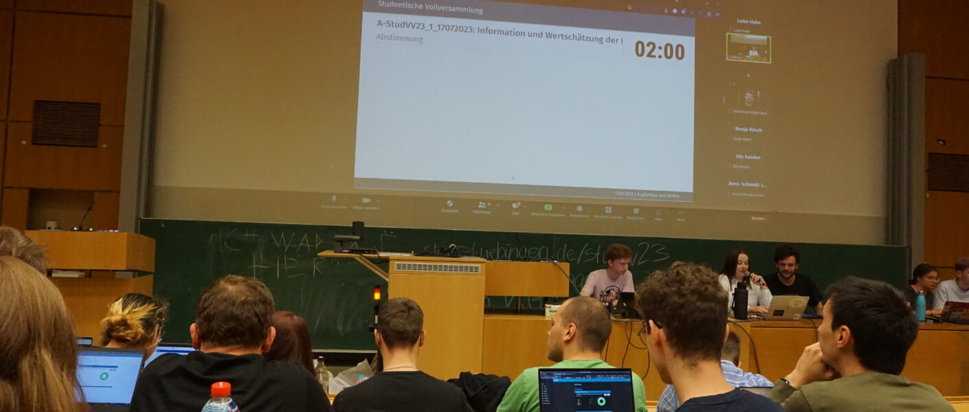 Rund 80 Studierende besuchten die Studentische Vollversammlung, die einmal im Semester stattfindet. Sie alle hatten die Möglichkeit, über die künftigen Entscheidung des StuRas mitzubestimmen. Während sie sich über die Unterstützung von Bündnissen wie „Tarifvertrag für studentische Beschäftigte“ oder „Wilhelmstraße autofrei!“ schnell einig waren, wurde über die Vereinheitlichung von Anwesenheitspflichten diskutiert. Außerdem beantwortete der Finanzreferent mit einem Überblick über die letzten Jahre offene Fragen zur Erhöhung des Semesterbeitrags.