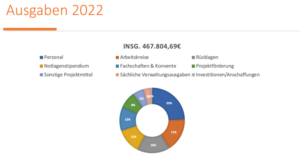 Moritz begann mit einer Zusammenfassung der finanziellen Situation der letzten Jahre. Die Verfasste Studierendenschaft bekam erst ab 2013 wieder Beiträge von den Studierenden. Von 2014 bis 2018 waren ihre Einnahmen hoch und ihre Ausgaben niedrig, weswegen sie 2018 Rücklagen von einer Millionen Euro angespart hatten. Der Landesrechnungshof forderte sie dazu auf, diese abzubauen mit der Begründung, sie seien eine Körperschaft des öffentlichen Rechts und es sei ihre Aufgabe, die Gelder, die sie einnähmen, auszugeben. Nur so kommen sie schließlich den Studierenden zugute. In Folge dessen wurde der Beitrag 2018 auf die derzeitigen 3,50 Euro gesenkt.