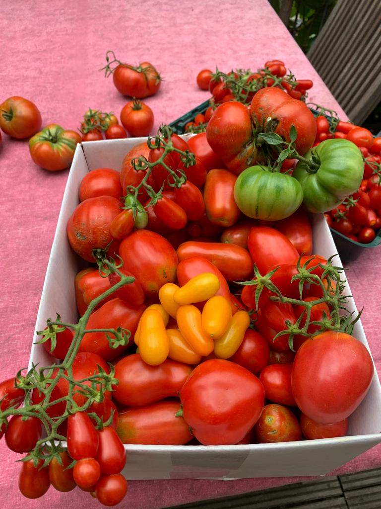 Diese Tomaten wachsen wie verrückt! Ich habe ein wenig die Übersicht verloren und habe einen Tomatendschungel erschaffen. Die Ernte gestaltet sich ein wenig mühsam. Dennoch weiterhin kiloweise Tomaten geerntet. Habe sie weitestgehend verschenkt als „Gruß aus meinem Garten“.  Die Nachbar*innen scheinen mir aus dem Weg zu gehen. Komisch.
