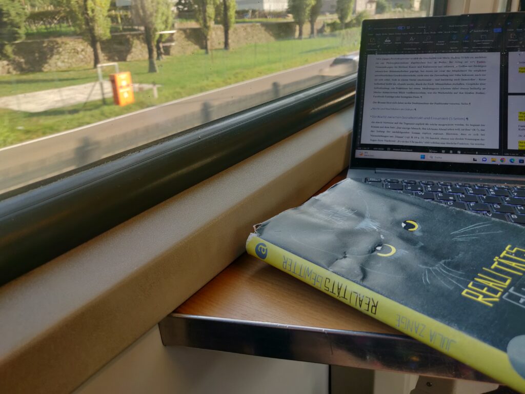 Schräg gegenüber von mir sitzt ein Mann, der sich eifrig Notizen in einem etwas zu groß geratenen Buch macht, das den ebenso mysteriösen, wie präzisen Titel „Herbstkursus 1921“ trägt. Seine Füße stecken in Wollsocken, dann in Treckingsandalen und während er in seine Lektüre vertieft ist, fördert er aus seinem Rucksack einen Apfel nach dem anderen zutage. Mein Mitfahrer neben mir klappt gerade seinen Laptop auf. Er ist mit Stickern versehen, anhand derer ich jetzt versuche, seinen Beruf, seine Herkunft und sein Reiseziel zu ermitteln. Vermutlich wäre Sherlock Holmes zumindest stolz auf meine Bemühungen, die ich irgendwann doch aufgebe, um mich in meine eigene Arbeit zu vertiefen – die im Zug, ganz ohne Wlan erstaunlich produktiv vonstatten geht.