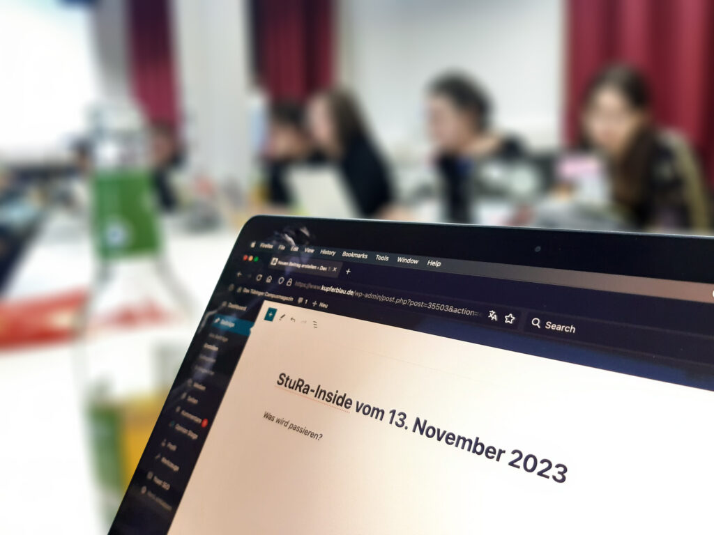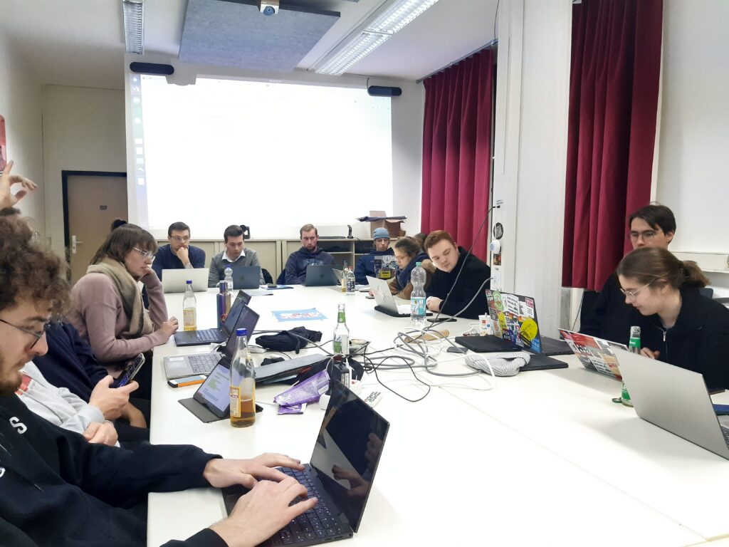 Nach anfänglichen Schwierigkeiten, allen Abgeordneten Zugriff zum System OpenSlides zu geben, dem Online-Abstimmungstool, das der StuRa seit dieser Sitzung verwendete, konnte diese beginnen. (Wieder etwas gelernt: OpenSlides verträgt sich nicht mit Firefox.) Schließlich konnte das Programm jedoch die Effizienz der Gremiumsarbeit optimieren.