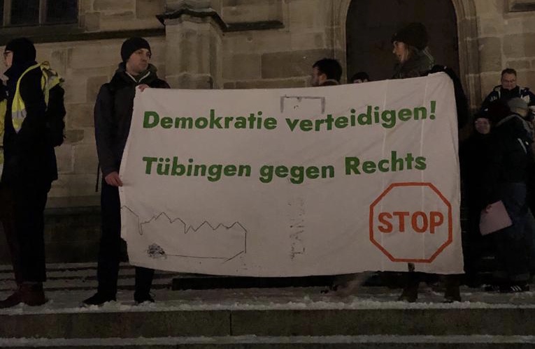 Der Holzmarkt ist dicht gedrängt mit Menschen. Studierende, alte Menschen, Familien mit Kindern: Alle sind zusammengekommen, um ein Zeichen zu setzen gegen Faschismus, gegen die AfD. An der Stiftskirche hängt ein Banner mit der Aufschrift „Nie wieder ist jetzt“. Anlass für die Kundgebung, die von einem breiten Bündnis, unter anderem aus „Fridays for Future Tübingen“, der Verfassten Studierendenschaft der Universität Tübingen, dem Jugendgemeinderat, dem Offenen Treff gegen Faschismus und Rassismus (OTFR) sowie ver.di organisiert wurde, sind die Recherchen von „Correctiv“. Diese berichteten von einem Treffen von AfD-Politikern, Neonazis und finanzstarken Unternehmer*innen, bei welchem die Vertreibung von Millionen von Menschen aus Deutschland geplant worden sein soll.