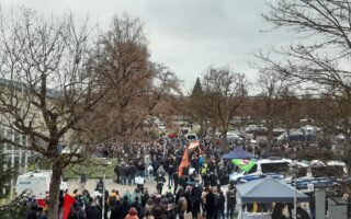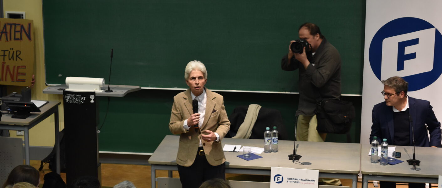 Marie-Agnes Strack-Zimmermann ließ sich aber von den Demonstrant*innen nicht beirren. Die Vorsitzende des Verteidigungsausschusses im Bundestag erntete vom Publikum stürmischen Applaus für ihre Rede. Das Audimax der Neuen Aula war komplett überfüllt, sodass zahlreiche Menschen beinahe zwei Stunden lang stehen mussten. „Krieg ohne Ende?“: Unter diesem Titel stand die Veranstaltung, die sich laut Ankündigung mit „Russlands Eroberungsdrang, dem Überlebenskampf der Ukraine und der deutschen Politik“ auseinandersetzte. Eingeladen hatte unter anderem das Institut für Osteuropäische Geschichte, dessen Leiter Klaus Gestwa  mit Strack-Zimmermann diskutierte.