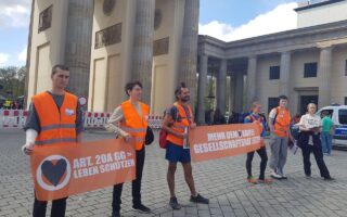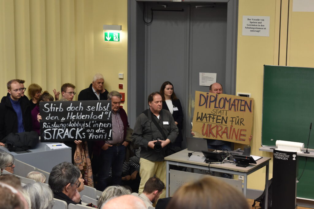 Dass an diesem Donnerstagnachmittag eine umstrittene Persönlichkeit in Tübingen erwartet wurde, war bereits vor Betreten der Neuen Aula weder zu übersehen noch zu überhören: Mit großen Plakaten und Trillerpfeifen wurden an der Podiumsdiskussion Interessierte auf dem Geschwister-Scholl-Platz empfangen. Im Audimax, in dem die Veranstaltung stattfinden sollte, positionierten sich die Demonstrant*innen links und rechts der Rednerin, um dem Publikum visuell ihre Forderungen entgegenzuhalten: „Diplomaten statt Waffen für Ukraine“ war etwa auf einem Transparent zu lesen, sowie der Vorwurf des Rüstungslobbyismus.