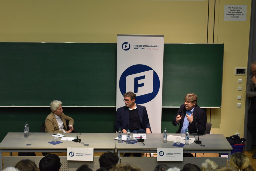 Christopher Gohl vom Weltethos-Institut (Mitte) moderierte die Diskussion zwischen Marie-Agnes Strack-Zimmermann (links) und Klaus Gestwa (rechts). Bild: Max Maucher