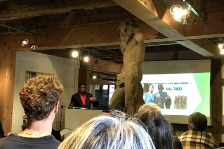Hagen Wagner präsentiert am 21. April 2023 im Brechtbau seine Bachelorarbeit zum Thema Overview Effekt als rhetorischer Fall